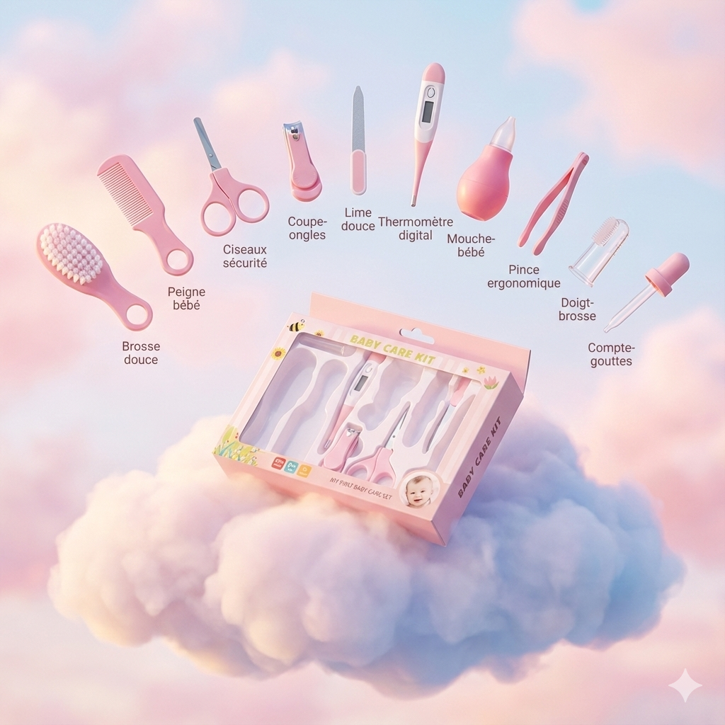 brosse douce, peigne, coupe-ongles, lime, ciseaux à bouts ronds, thermomètre, mouche-bébé, pince à épiler, tétine de soin, petit doigtier de massage.